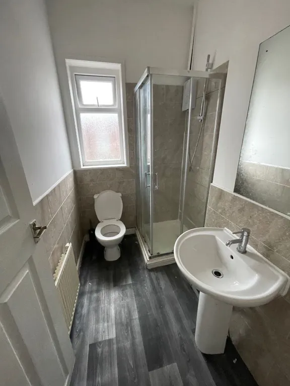 Fitted with a standing shower, pedestal wash hand basin, and low-flush WC. Ceiling light point. Radiator.